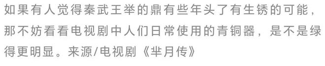 在剧中,秦武王举起的青铜鼎和我们今天在博物馆中看到的十分相似,都是青绿色的,似乎没什么问题。
