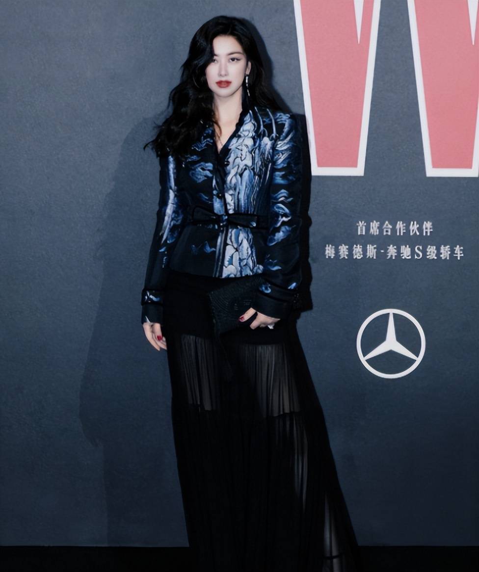朱珠身着古着上衣,搭配浪和复古红唇,复古韵味十足,只是上衣略显厚重,下面的透肉长纱也少了些许呼吸感,在整体造型的轻盈感上稍有欠缺。