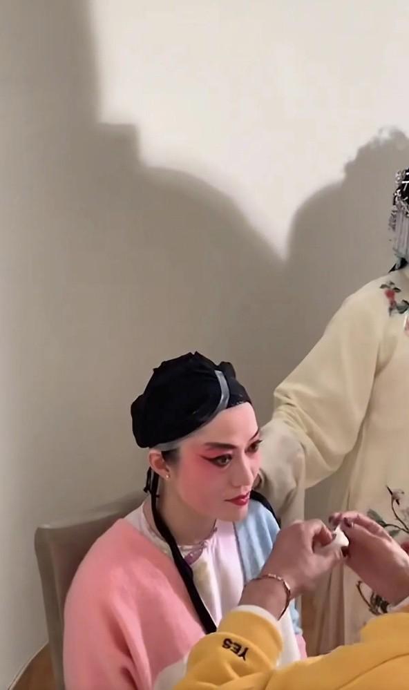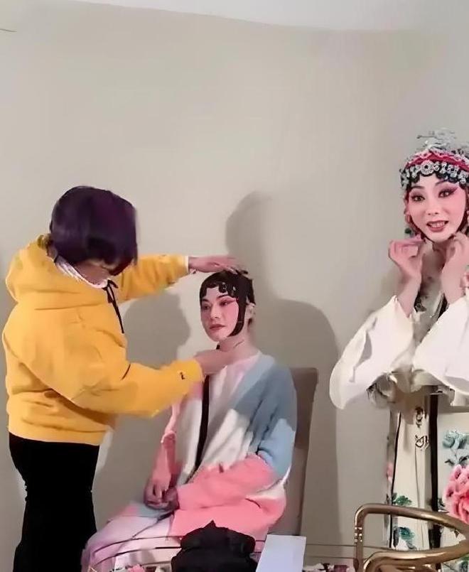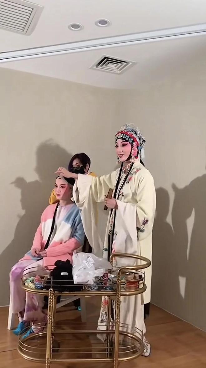 她穿上了戏服,打扮成了昆曲中的青衣造型,应该是和专业团队一起表演,过把戏瘾。